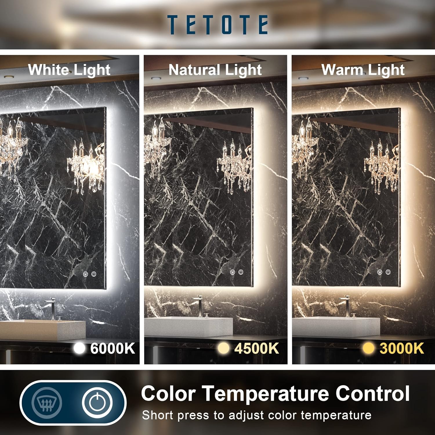 TETOTE 40 x 24 LED Backlit Vanity Mirror Bathroom,3Color White/Warm/Natural,Anti-Fog Lighted Mirror,Dimmable,Wall Mounted