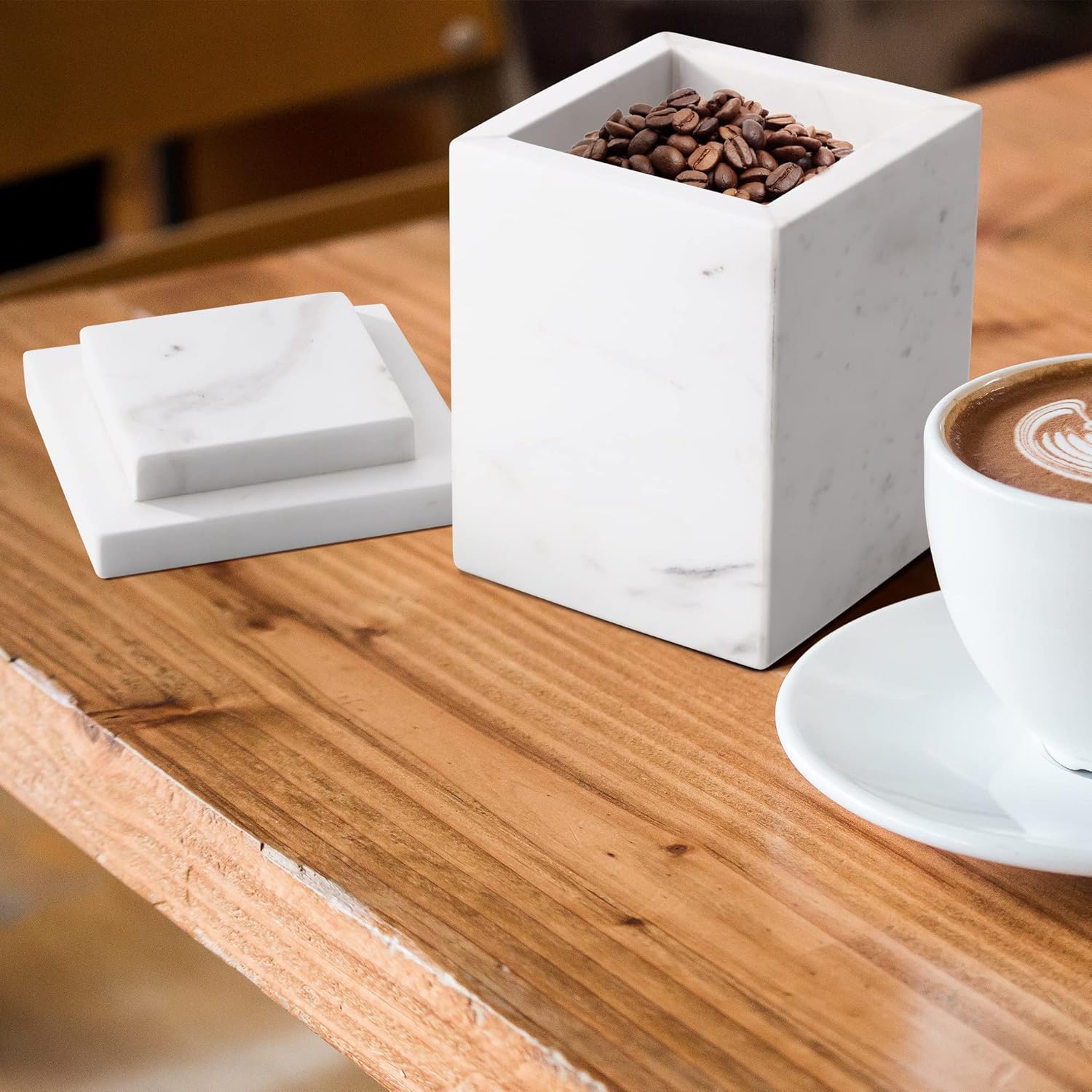 WORHE Marble Canister Natural Stone Qtip Holder with Lid Square Bathroom Vanity Organizer for Makeup Sponge Coffee Bean Dispenser Storage Jar Case for Home Decor White (DLW201)