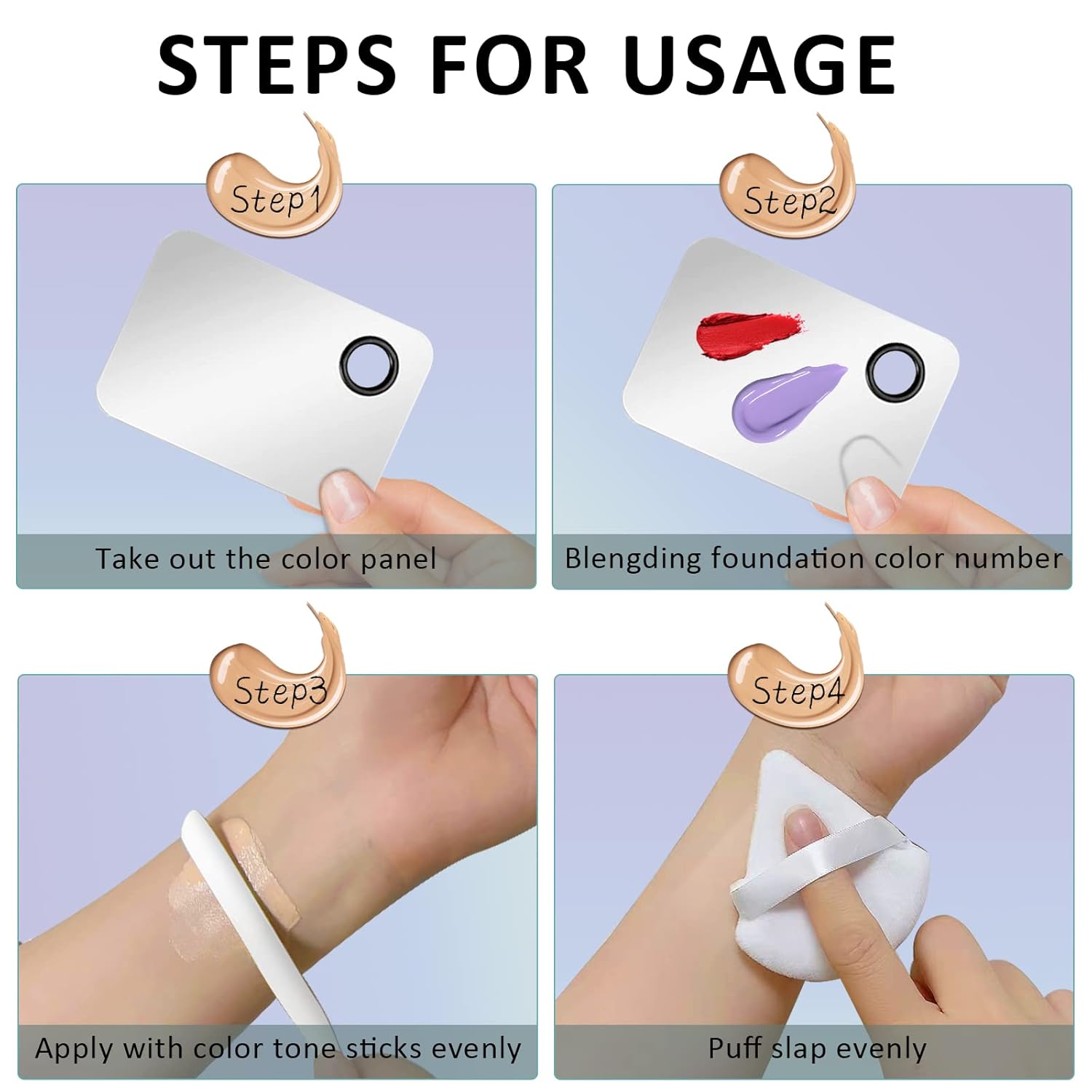 - DIY Liquid Foundation: The Stainless Steel Makeup Spatula and Palette Set is used to adjust the color of the liquid foundation, neutralize and evenly mix the liquid foundation to create a suitable foundation color.