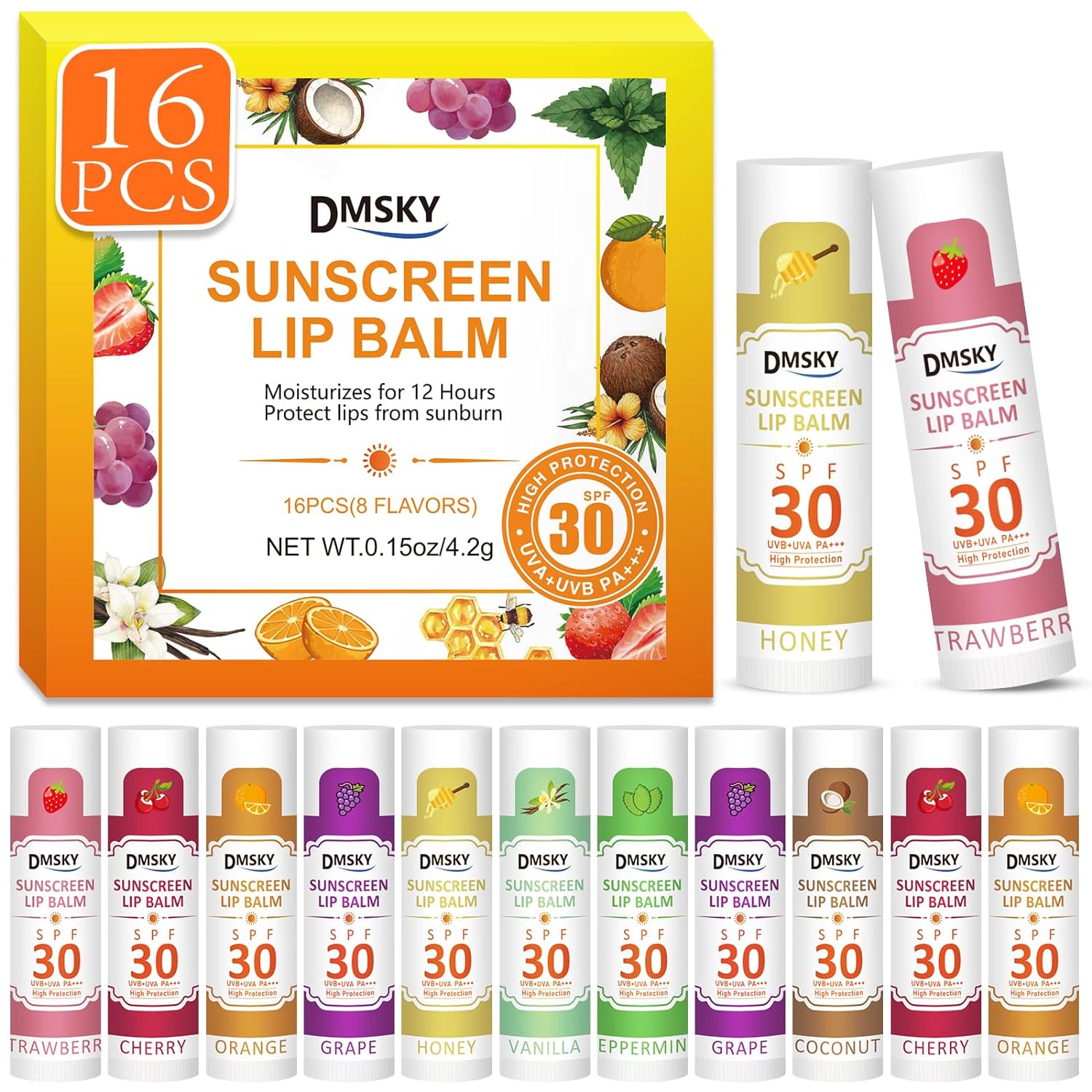 DMSKY SPF 30 Lip Balm Bulk 16 Pack, Sunscreen Lip Balm Broad Spectrum UVA/UVB Protection, Travel Size Sunscreen for Lips