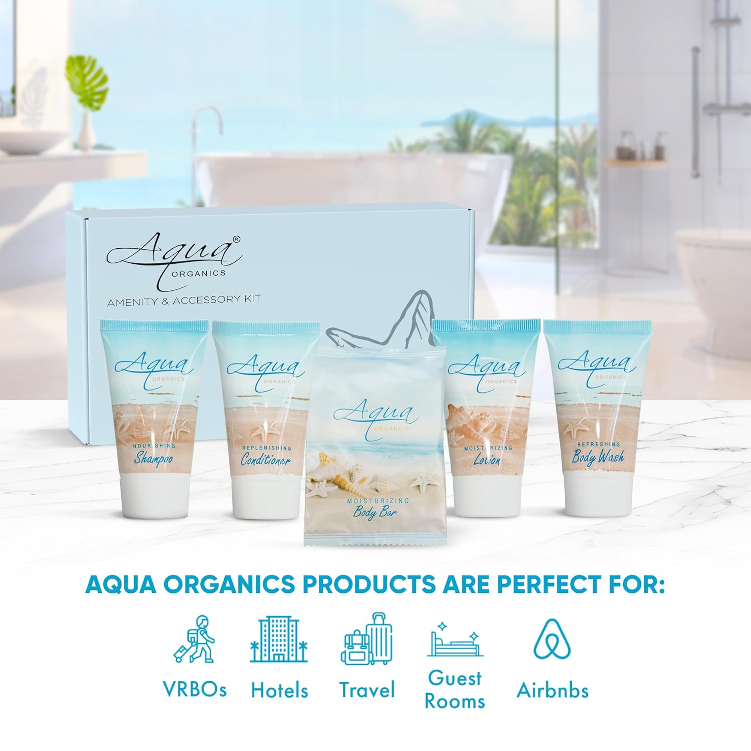 1-Shoppe All-In-Kit|Aqua Organics Amenity Kit|Boxed Hotel Toiletries|Bulk Set 1oz Travel Size Shampoo,Conditioner,Lotion,Body Wash & Bar Soap for Guest Hospitality AirBnB/Vacation Rentals|5 Pieces