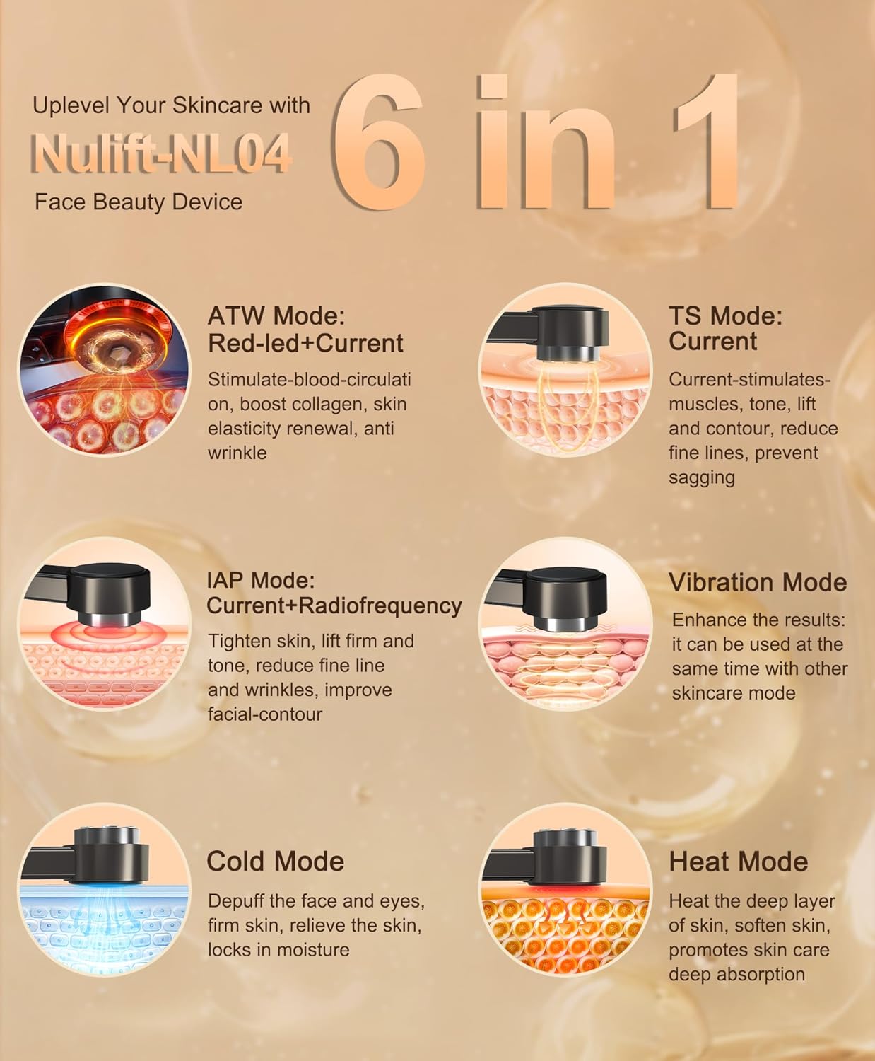 - 6-in-1 Skin Transformer:Ditch the traditional beauty tool cleaning your vanity! - Our Nulift-NL04 face rf skin tightening device combines 6 skincare tech: IAP mode: Collagen-Boosting bipolar RF+current (5W provides slightly warmth & a stinging sensation), TS mode: current-sculpts jawline, ATW mode: current+red led, lymphatic-drainage & boost collagen. Hot Mode:opens pores for serum infusion, Cooling: instantly tightens & depuffs, Vibration:Mimics facial massage, potentially boost-circulation