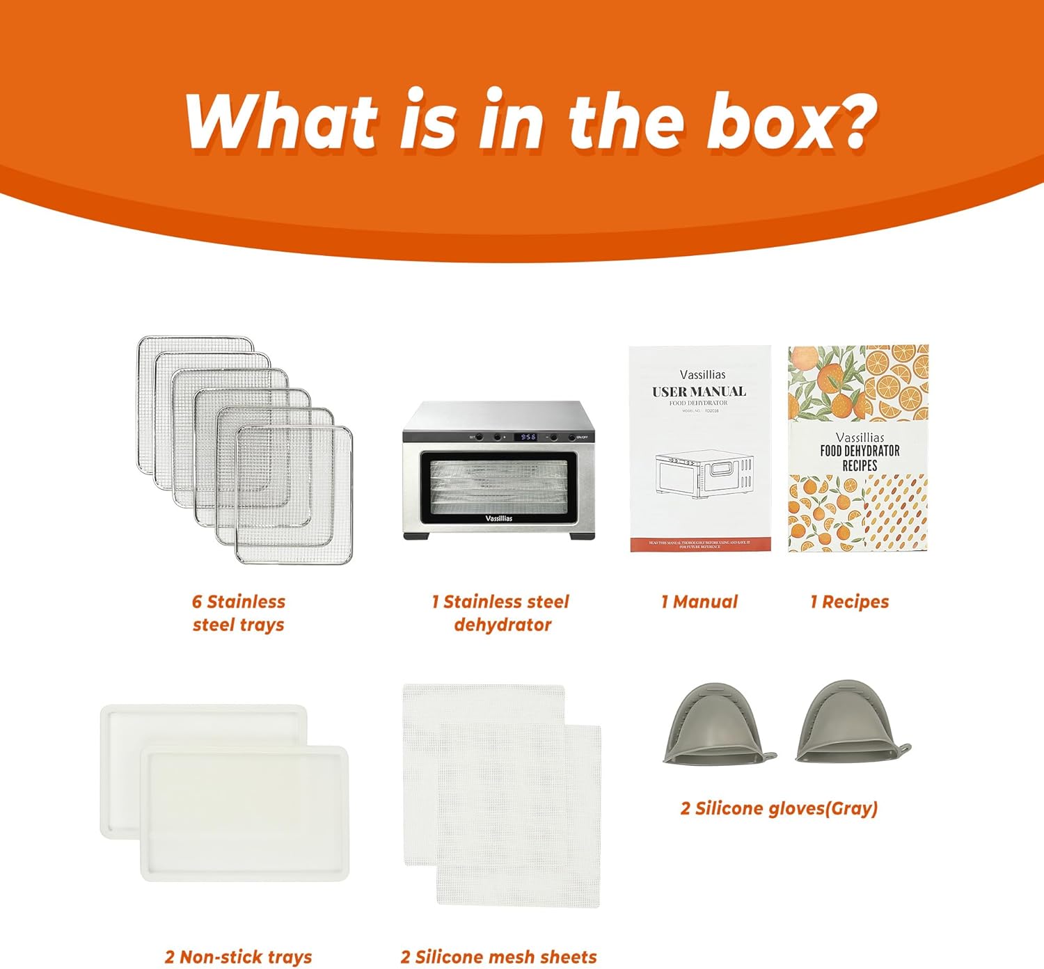 - WHAT'S IN BOX - Included 1 stainless steel dehydrator, 6 stainless steel trays, 2 silicone mesh trays for drying fine foods, 2 trays for catching water or making fruit roll-ups, 2 silicone gloves, 1 recipes and 1 manual