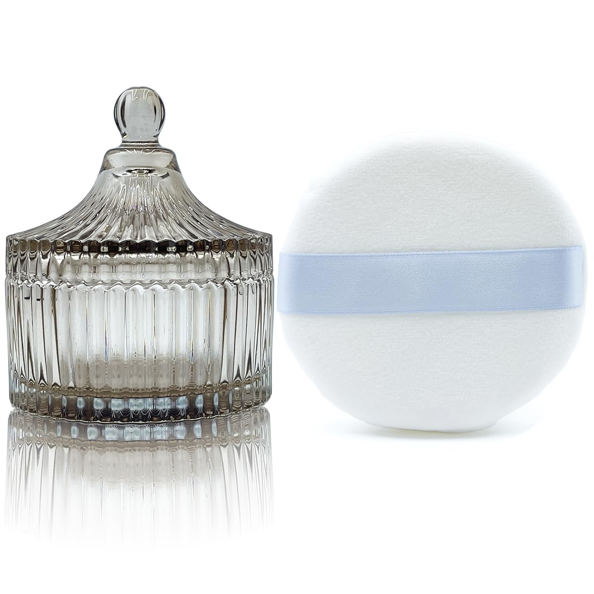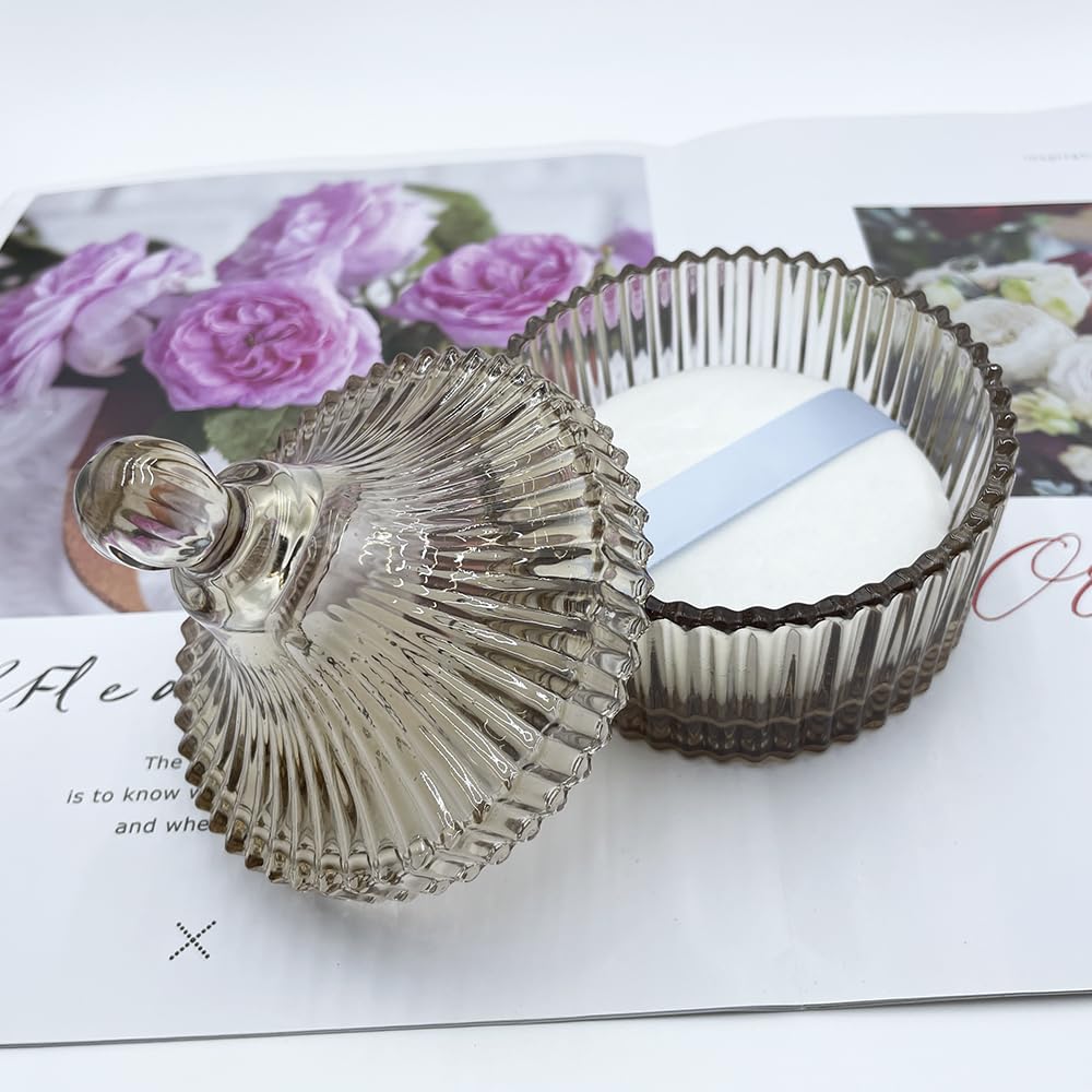 - Size:Powder puff:Diameter 3.3 inches,Thickness 0.6 inches.Glass container:Diameter: 3.8 inches,Height: 4.8 inches (including lid).This is a perfect combination of powder puff and container,elegant and concise,both practical and beautiful.