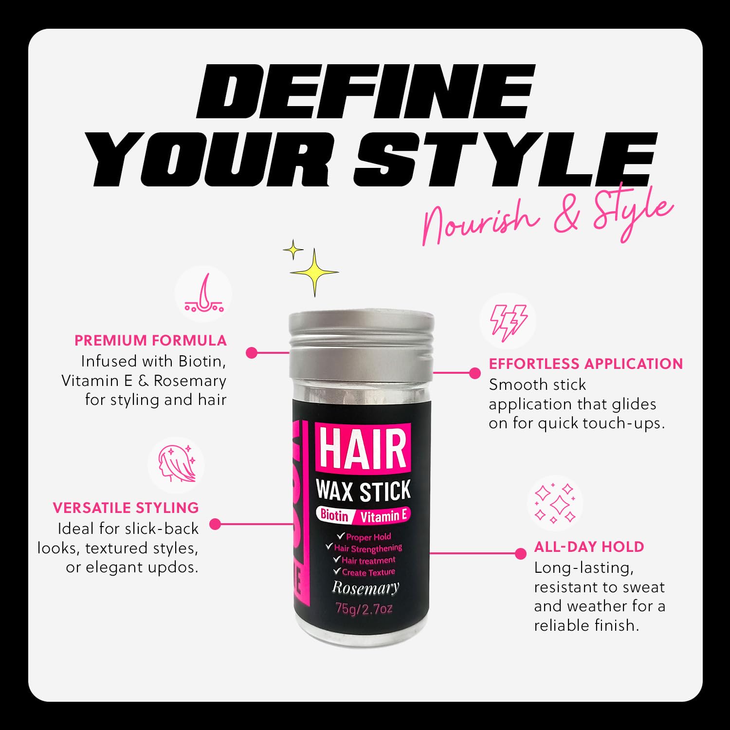 - Strong Hold: No more worrying about unruly hair disrupting your polished appearance, this versatile wax stick is perfect for creating elegant updos or slicked-back styles that demand attention while allowing you to freely express your unique personality.
