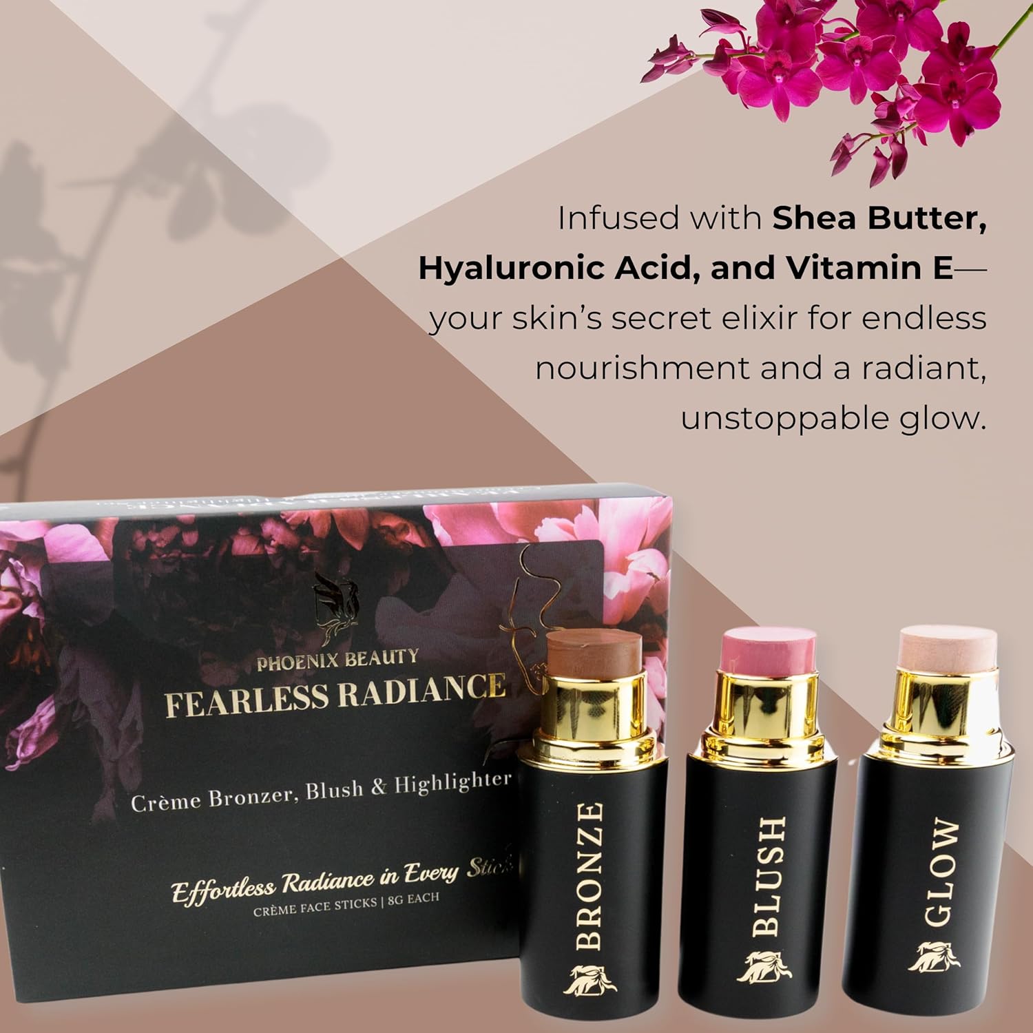 Cream Contour Stick Set – Blush, Bronzer & Highlighter Trio | Hydrating, Buildable, High-Pigment Makeup with Shea Butter & Vitamin E | Phoenix Beauty Gift Set (Enchanted)