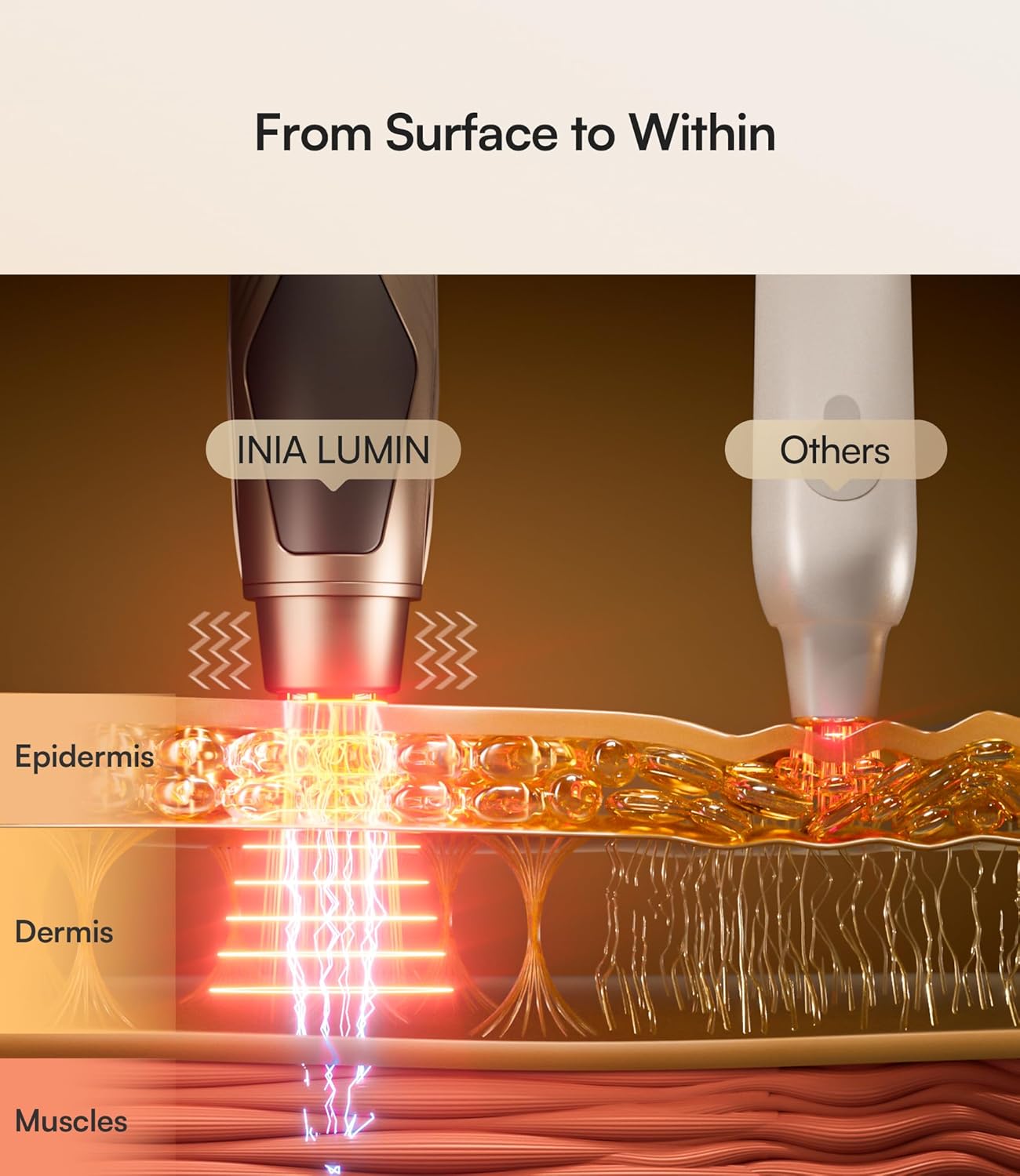 - Streamline Your Routine: Why clutter your counter with four separate tools? INIA LUMIN eye skincare device replaces your red light wand, vibration device, heated massager, and metal roller. Designed for all skin, it simplifies your regimen while effectively enhancing radiance and firming skin with consistent use.