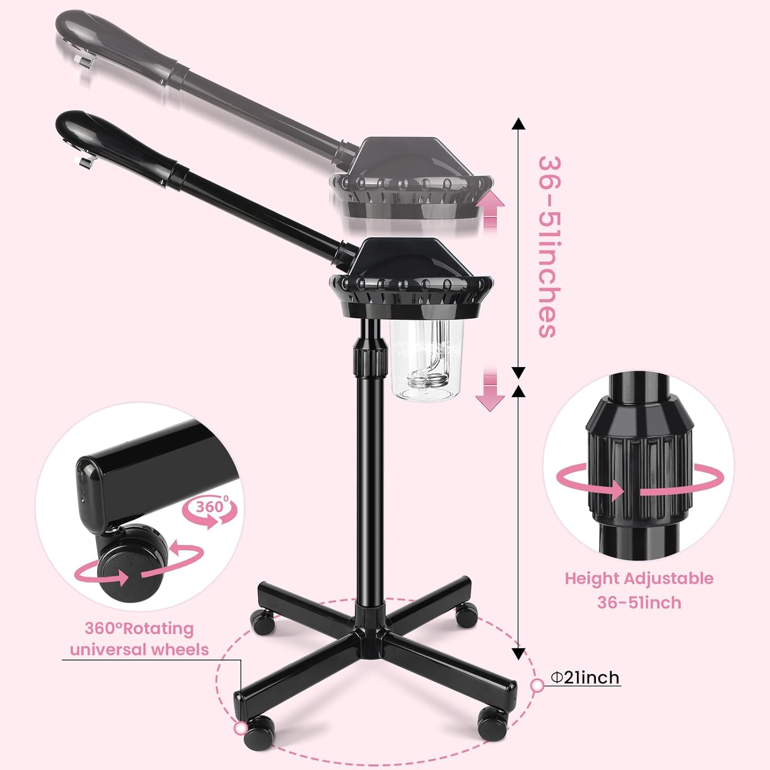 - 【Facial Steamer Professional】Our facial steamer comes with an upgraded atomizing cartridge, more hot mist, 650ml removable water cup, 36-51 inch adjustable height, 360° rotating nozzle and 360° rotating body.
