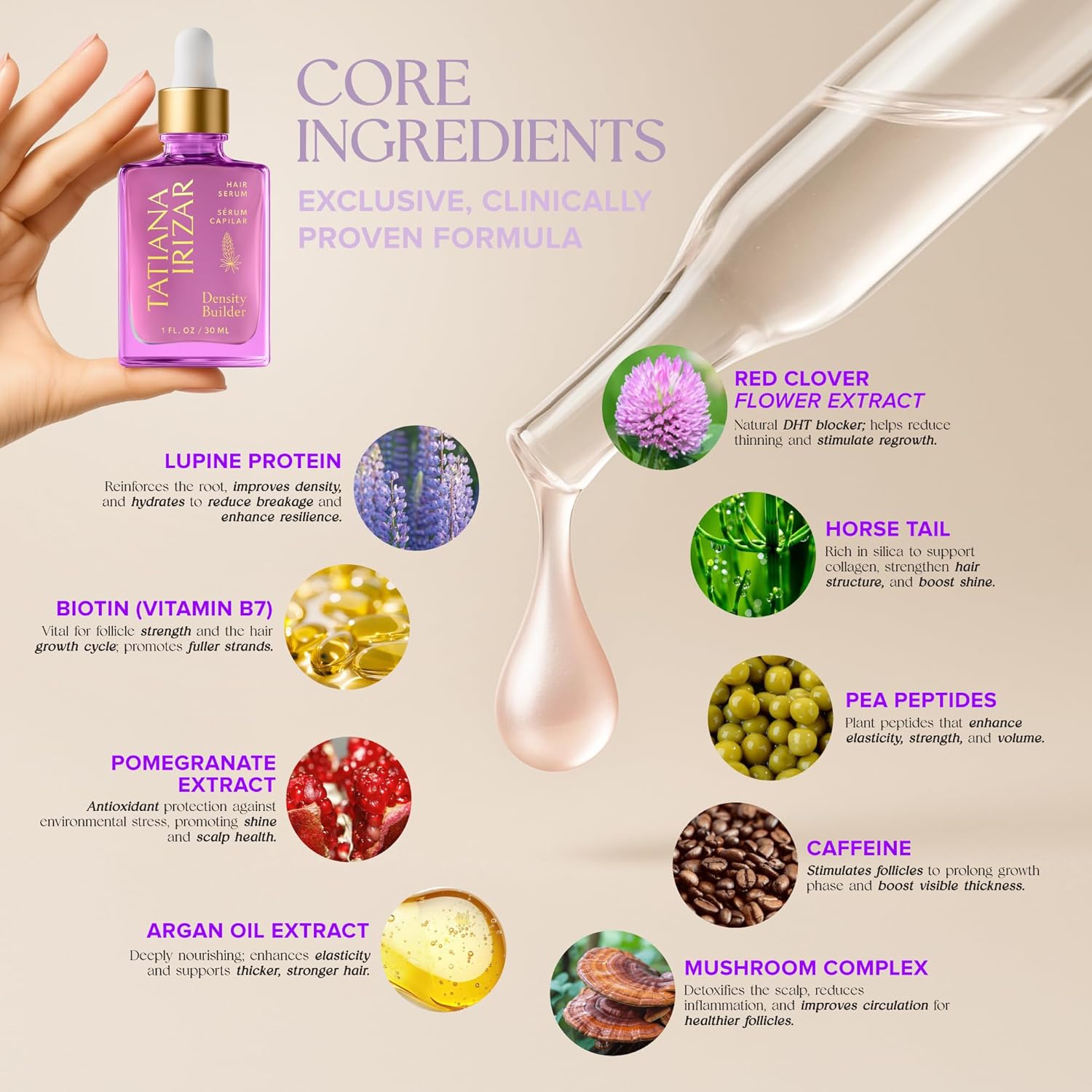 - POWERFUL HAIR THICKENING FORMULA – CLINICALLY TESTED INGREDIENTS: Tackle thinning hair head-on with our advanced thicker fuller hair growth serum. Formulated in the USA with Lupine Protein, Pea Peptides, Argan Extract, and Biotin, this potent blend strengthens hair, boosts density, and promotes visibly fuller, healthier-looking hair. Includes Red Clover, Horsetail, Mushroom Complex, Pomegranate, and Caffeine for a 360° scalp treatment.