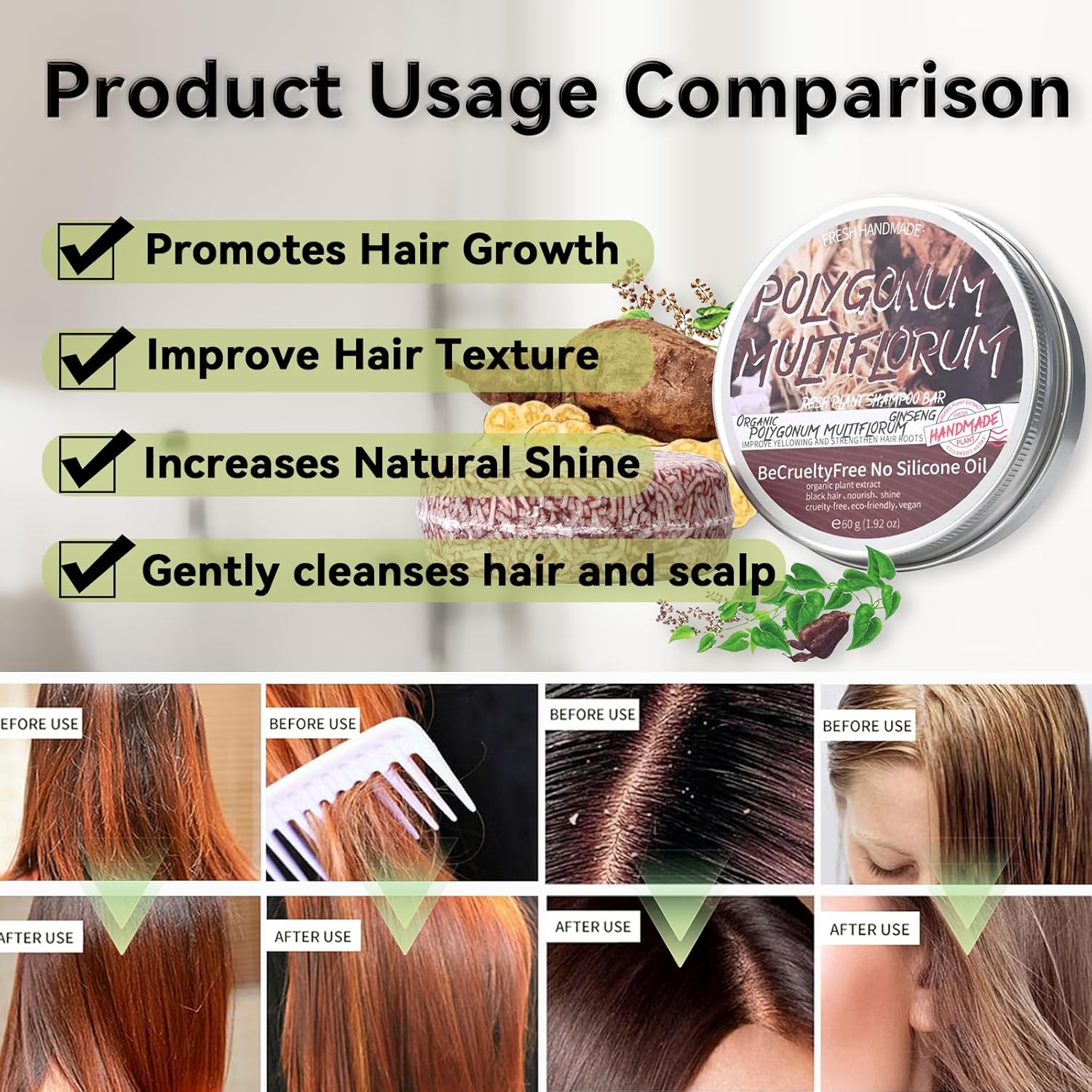 - 【Safe Ingredients】Shouwu Blackening Shampoo Bar uses pure natural ingredients, including shouwu blackening extract, shea butter, olive oil, coconut oil, and other ingredients. It has a mild effect and does not hurt the scalp. Therefore, you can use it with confidence even if you have sensitive skin.