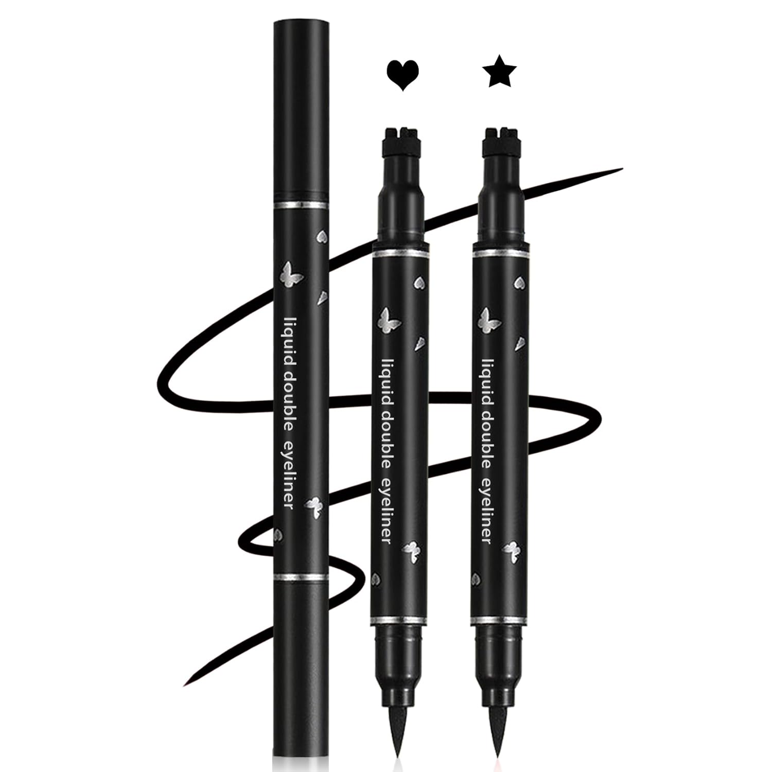 2PCS Double-headed Eyeliner Stamp Pencil Black Liquid Winged Eyeliner Stamp Pen Waterproof Smudgeproof Eye Liner Stamp for Eye Makeup(Heart+Star)