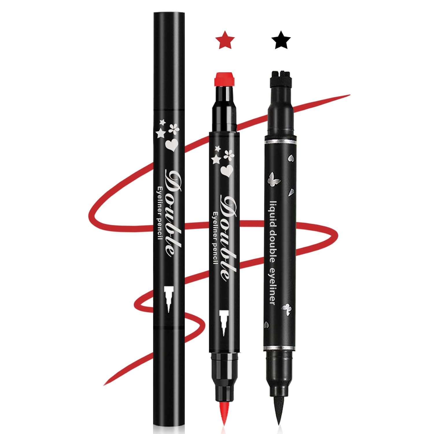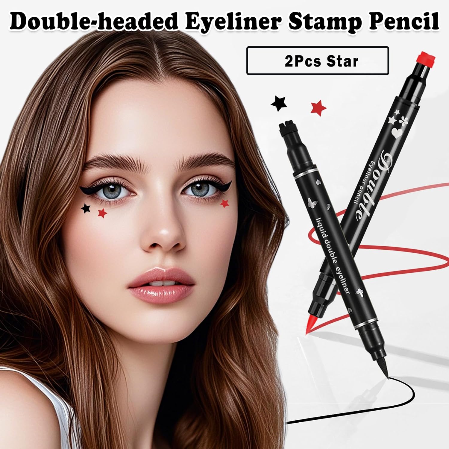 2PCS Double-headed Eyeliner Stamp Pencil Black and Red Liquid Winged Eyeliner Stamp Pen Waterproof Smudgeproof Eye Liner Stamp for Eye Makeup(Star)